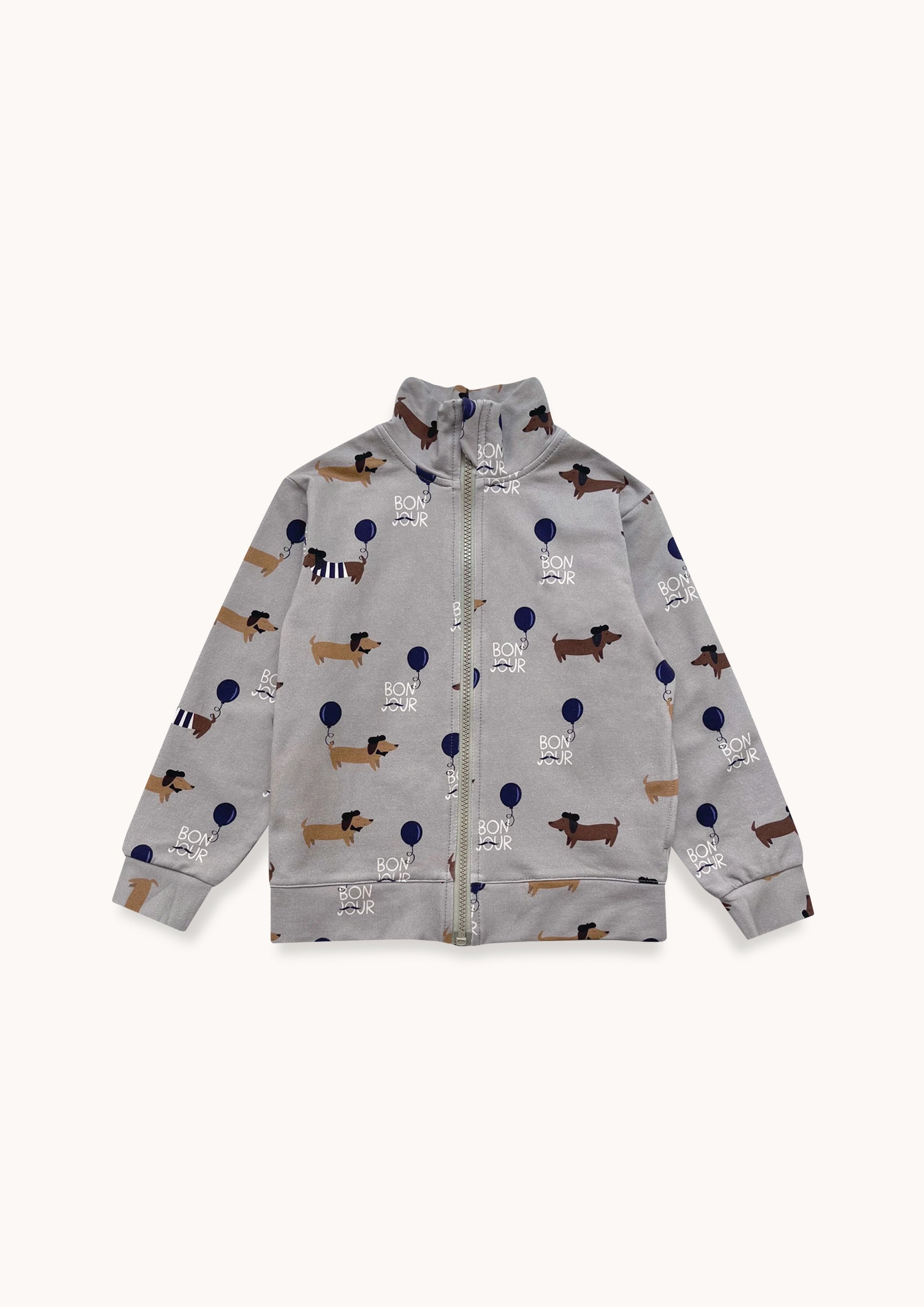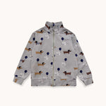 2025. gada rudens/ziemas kolekcijas "BONJOUR" birstēta džersija jaka ar suņu apdruku visapkārt, izgatavota no atbildīgi iegūtiem materiāliem.