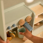 Welcome to the coziest coffee corner! Serve a delicious cup of coffee or tea with a fresh sandwich or pastry. With this beautiful toy coffee corner, your little one can press buttons, choose the right setting, and place a coffee pad for a true barista experience. The set includes a coffee and tea machine, storage space for cups, and a cabinet to display all the tasty treats. Who’s coming to order something delicious?