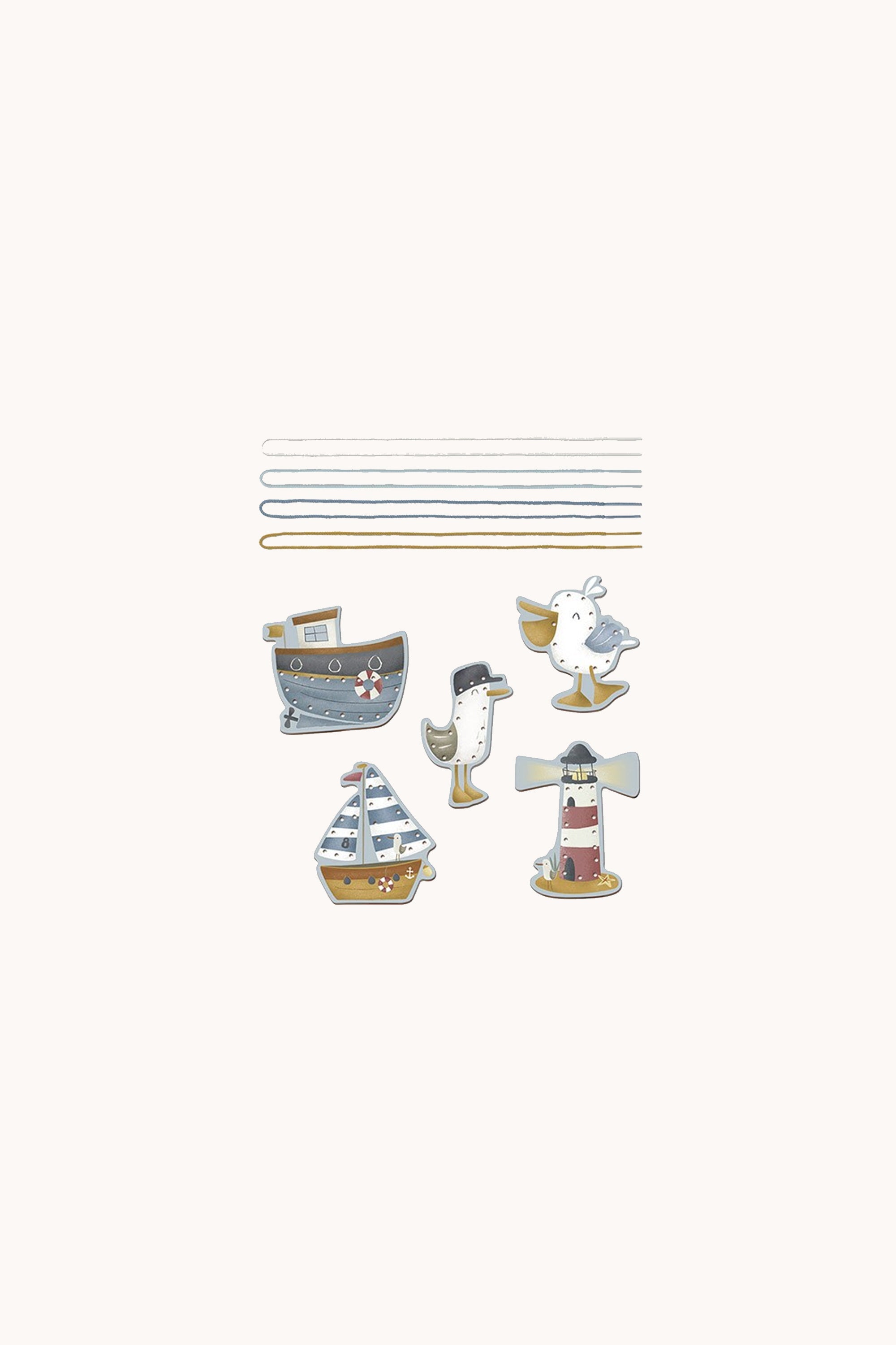 Let’s get lacing! Follow the pattern of the cool pictures. Pull the string through the little holes to add some details to the mainsail of the sailboat, or to the lower deck of the fisherman´s boat. Lace along the lighthouse, the pelican and Jack the seagull. A fun and engaging activity. This set of lacing of cards comes with one string tipped by aglets for easy stringing and 5 cardboard cards with the beautiful illustrations of the Sailors Bay collection. Toddlers will love practicing their fine motor skills by lacing the string through the small holes with perfect precision. Hours of fun and play guaranteed!