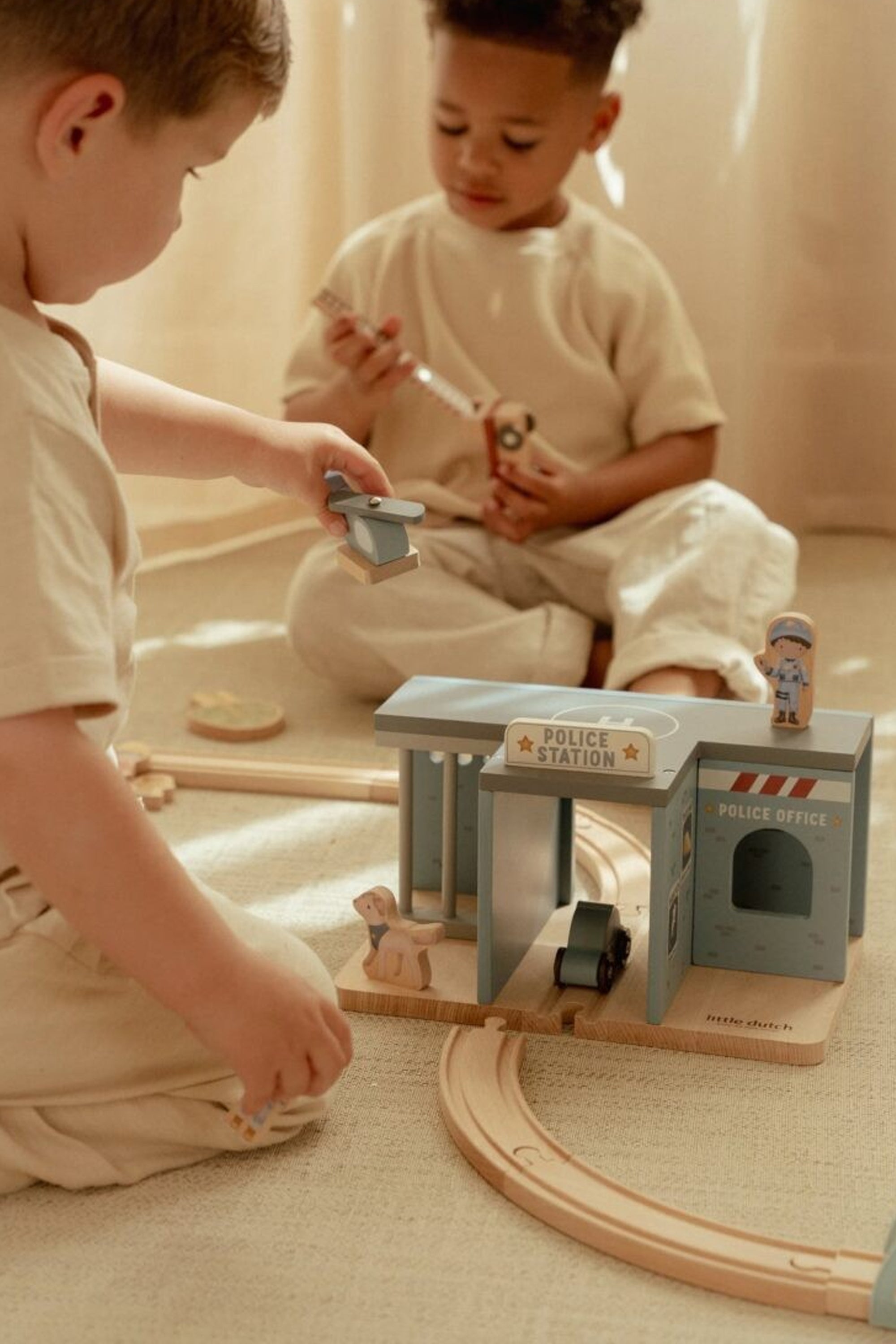 Thief spotted! This wooden police station has everything for exciting police stories. It includes a police car, a helicopter, an officer, a thief, and even a police dog! The station features a jail cell with bars and a landing platform. Lock up the thief and keep the city safe. This police station toy is a perfect addition to the wooden train track XL and encourages imaginative play. Who will you take to the station?