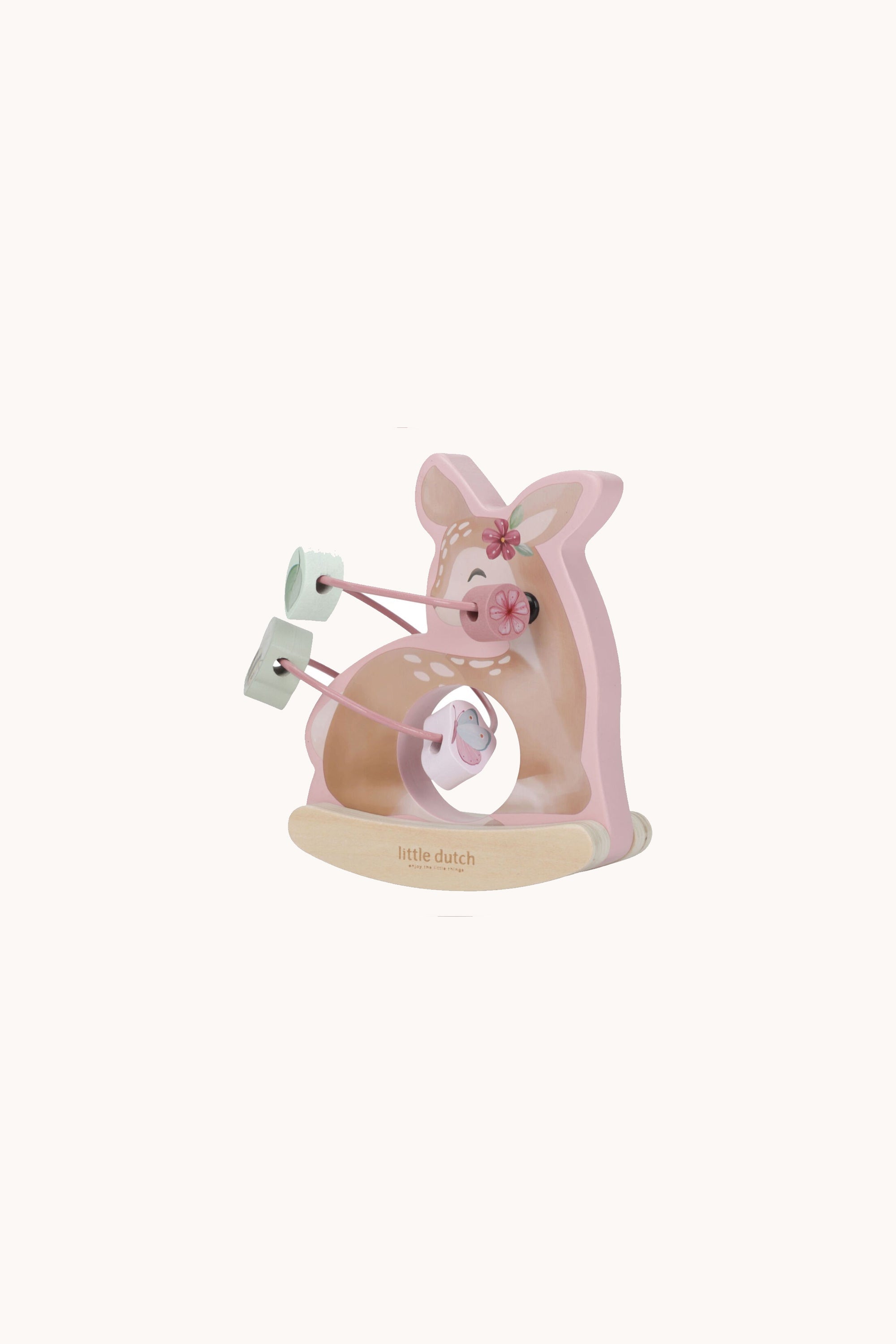 Let the beads spiral around the wooden deer as she rocks back and forth. Encouraging playful interaction, this charming toy invites you to give her a gentle push, setting her in motion to the soft hum of the buzzing bee that flutters around her. Together with the flowers, leaves and mushrooms of Fairy Garden, the bee eagerly navigates the spiral path, dancing across the deer’s surface. A delightful fusion of entertainment and decor, this toy not only fosters motor skills but also adds a touch of magic to any playtime experience.