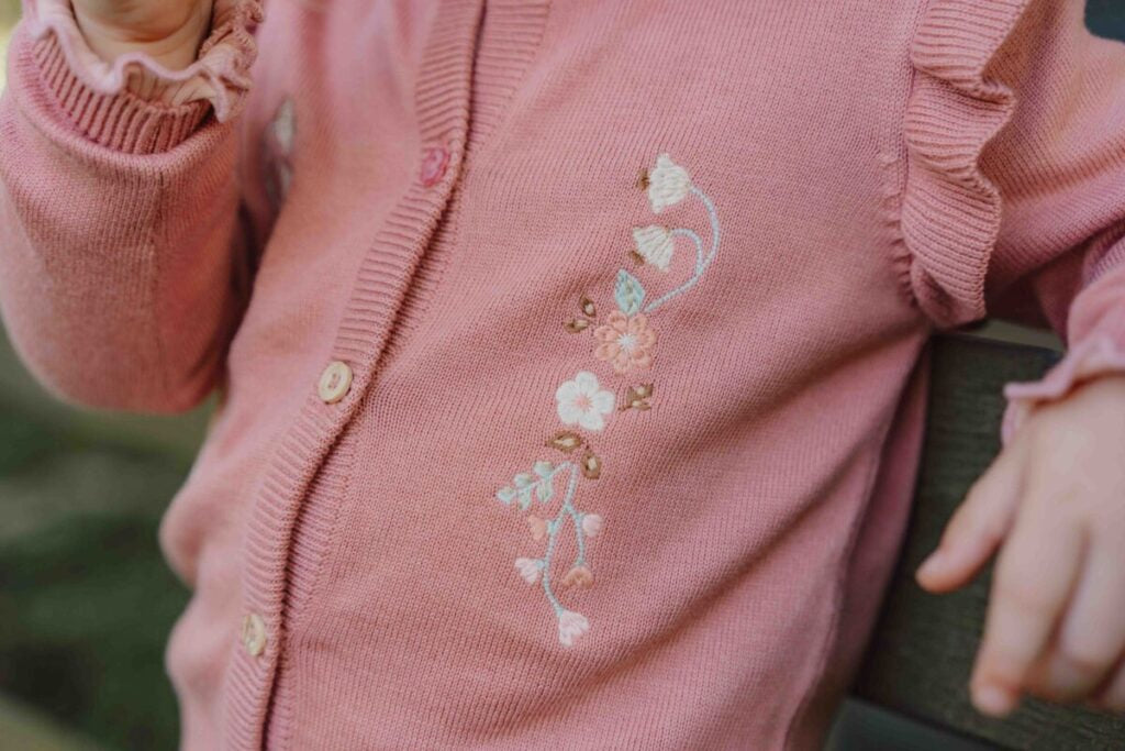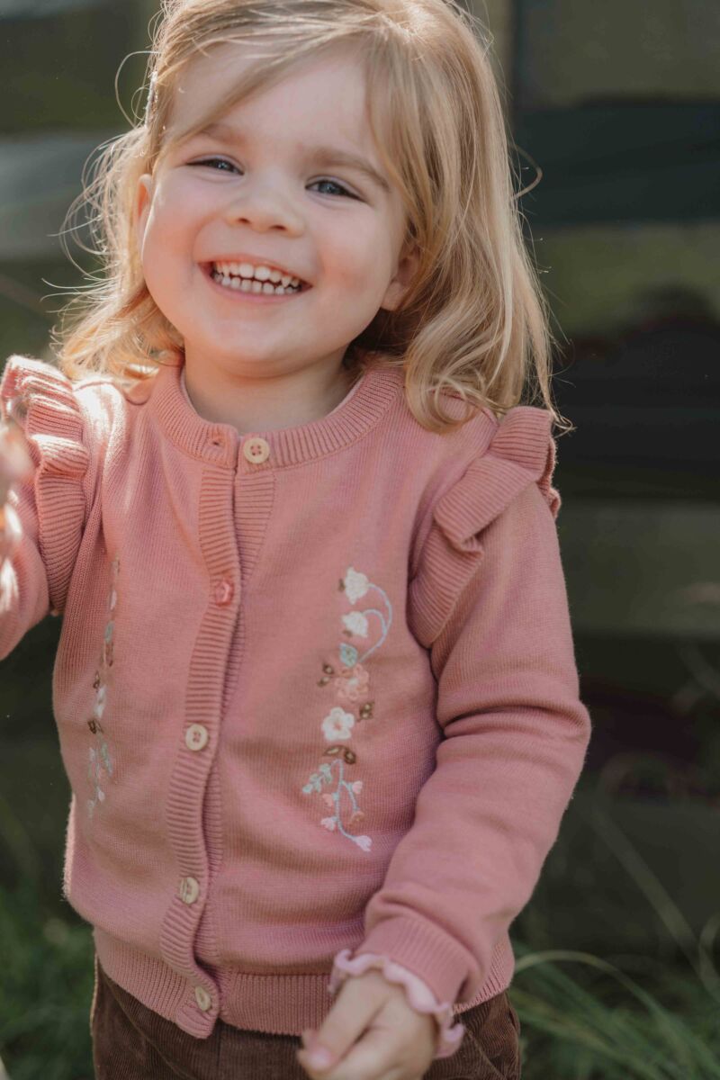 Šis jaukais adītais kardigans aizvedīs jūs uz lauku ziedu pļavām. Silti rozā krāsa ir dekorēta ar lieliem ziedu izšuvumiem uz krūtīm un volāniem uz pleciem. Iekļautas koka imitācijas pogas, tostarp uzmanību piesaistoša zieda formas poga. Izgatavots no mīkstas organiskās kokvilnas, šis ērtais kardigans ir lieliski piemērots kā papildu siltuma slānis aukstākās dienās.