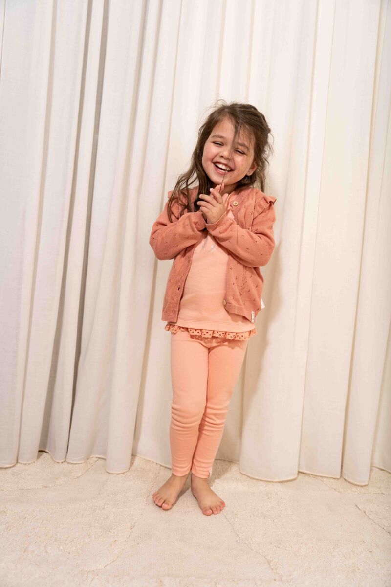 Šis jaukais adītais kardigans aizvedīs jūs uz lauku ziedu pļavām. Silti rozā krāsa ir dekorēta ar lieliem ziedu izšuvumiem uz krūtīm un volāniem uz pleciem. Iekļautas koka imitācijas pogas, tostarp uzmanību piesaistoša zieda formas poga. Izgatavots no mīkstas organiskās kokvilnas, šis ērtais kardigans ir lieliski piemērots kā papildu siltuma slānis aukstākās dienās.